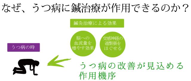 コクランライブラリーという病気に対する治療法を評価したデータベースに、鍼灸がうつ病改善に期待できるという記載があります。こちらのサイトを参考にして下さい。